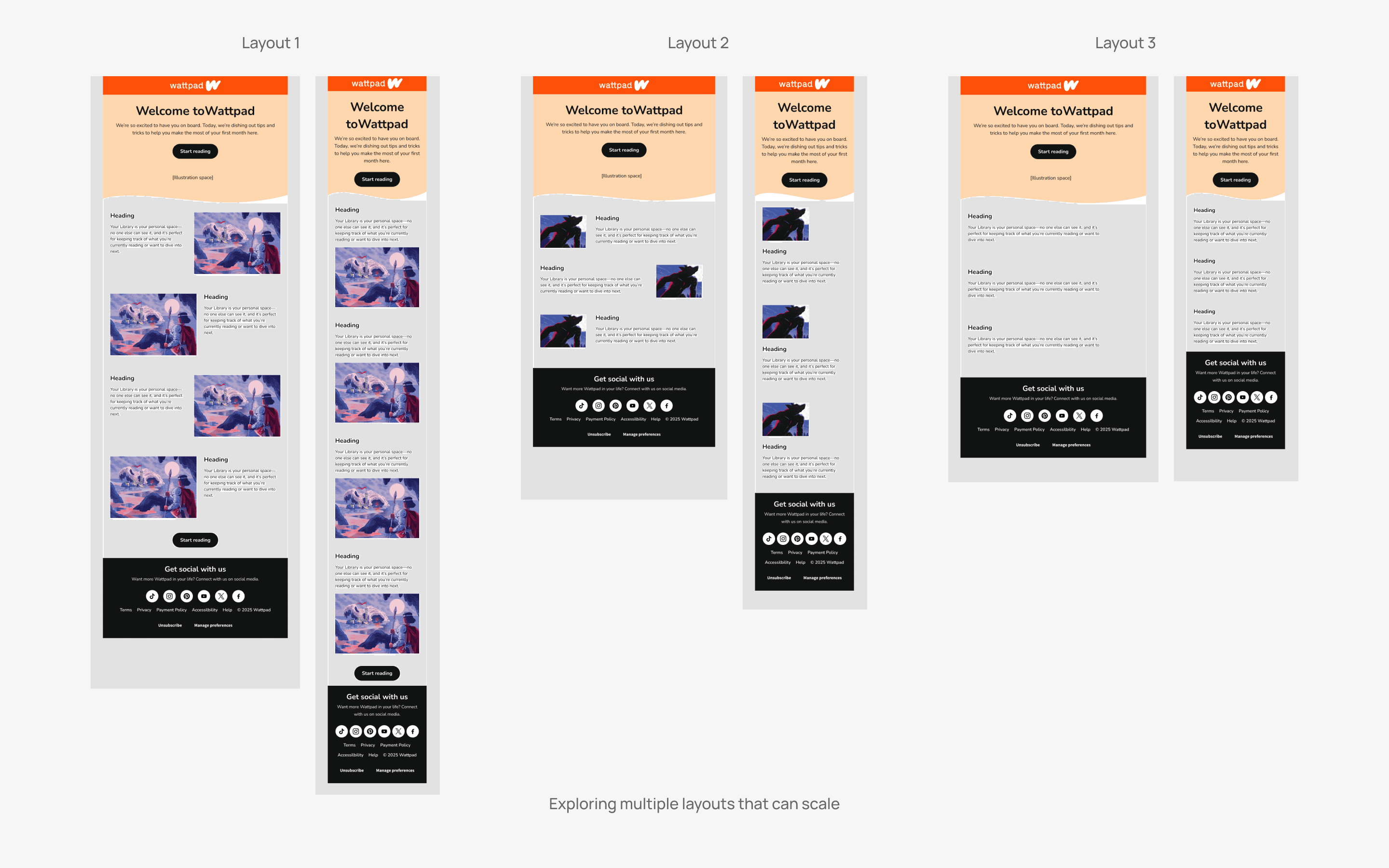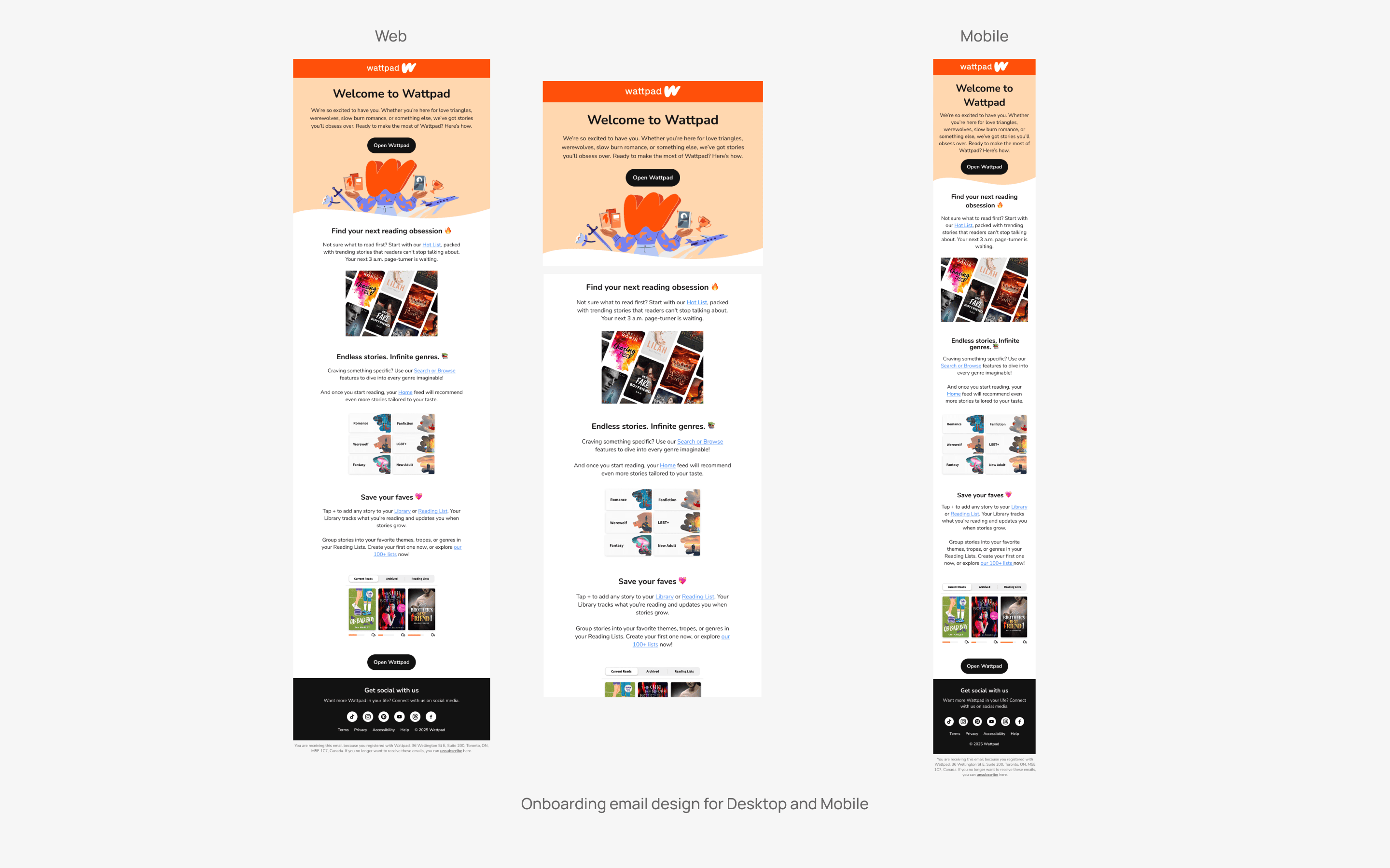 • Defined a completely new scalable email template for the Marketing Team. • Worked closely with my PM and Marketing Team to determine and define how each section with the newsletter would foucs on engaging new users with Wattpad Content. • Paired with Art Director to align on the right assets for the newsletter. • Worked alongside the engineer to ensure handoff and implementation of the newsletter