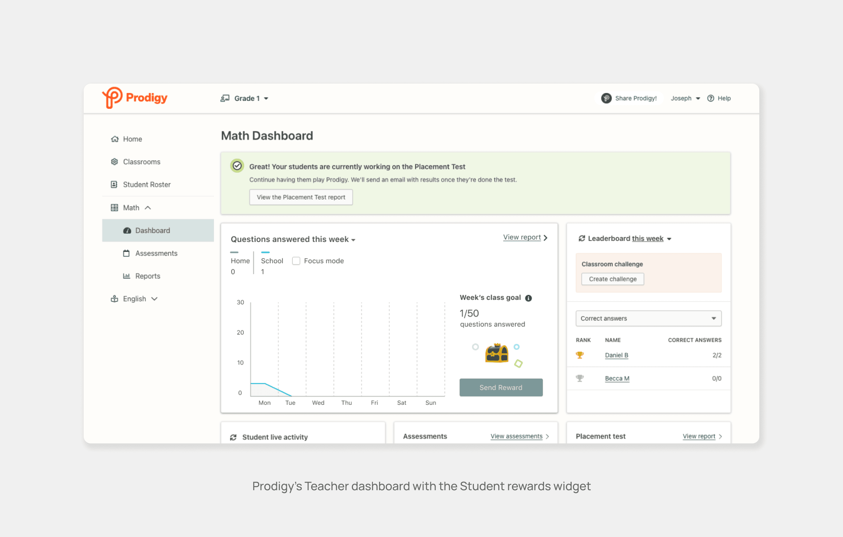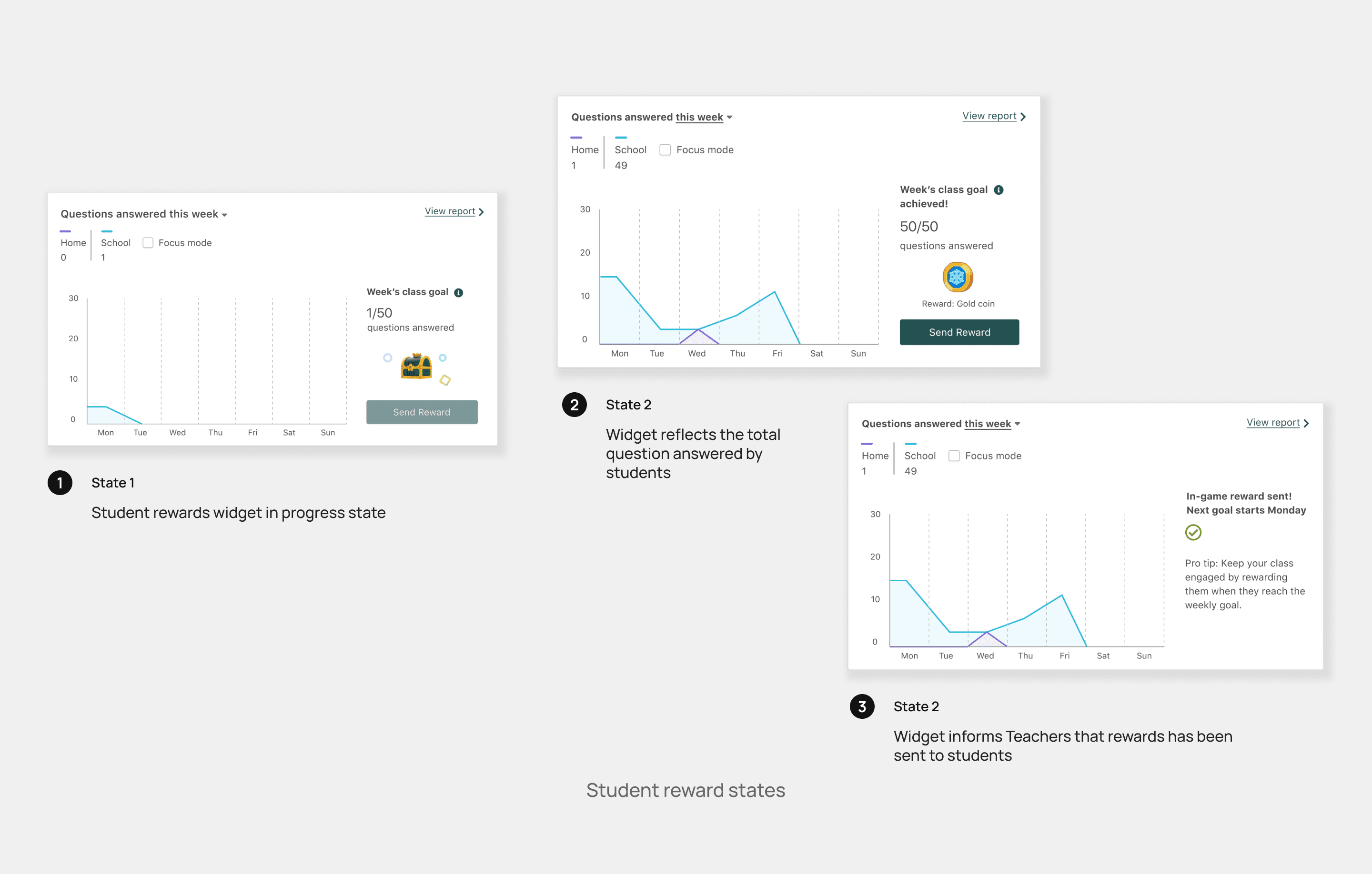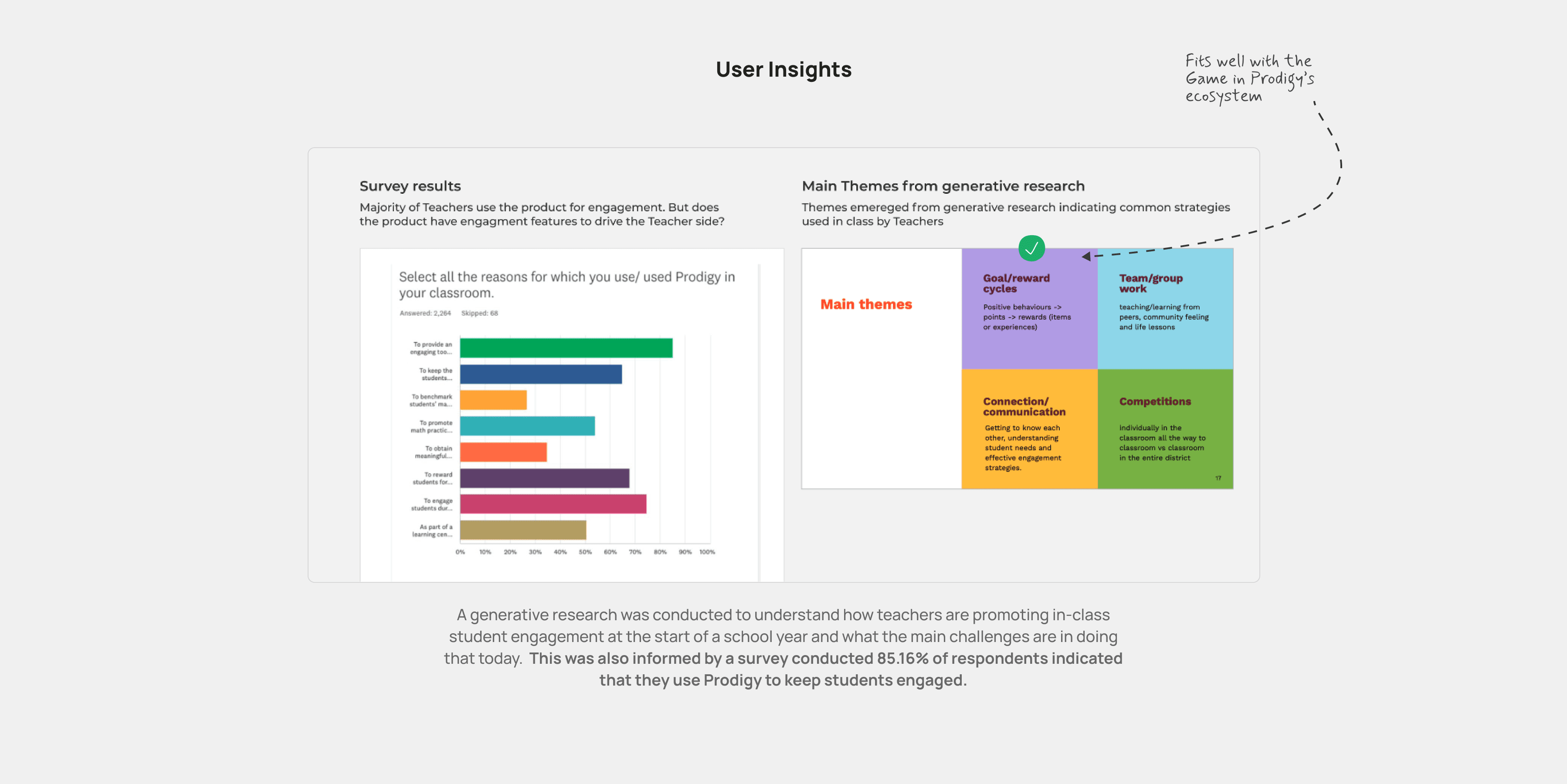 To increase engagement and retention of both Teachers and students, we need to enable teachers to take an action and inturn students completing the task for a reward. Through generative research, we learnt that a goal-reward system was one of the most common strategies used by Teachers in school and we want to create a similar system with Prodigy's offerings.