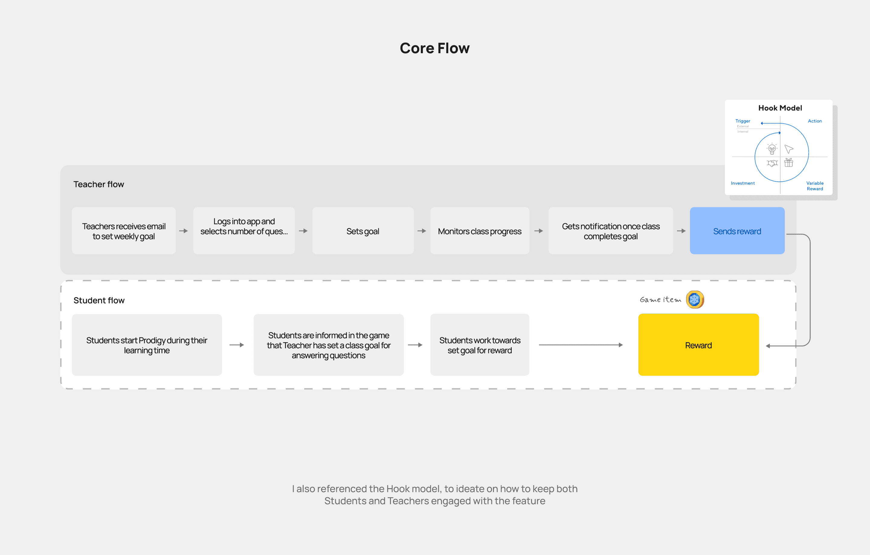 I leveraged the hook model to create a system between the Teachers and the students. In order to ensure that Teachers are able to access the feature right upfront, the reward feature was designed to be on the dashboard from where a Teacher can review the peformance of the entire class. I also worked closely with Teachers to understand their setup in school and how this system would work in their day to day working.
